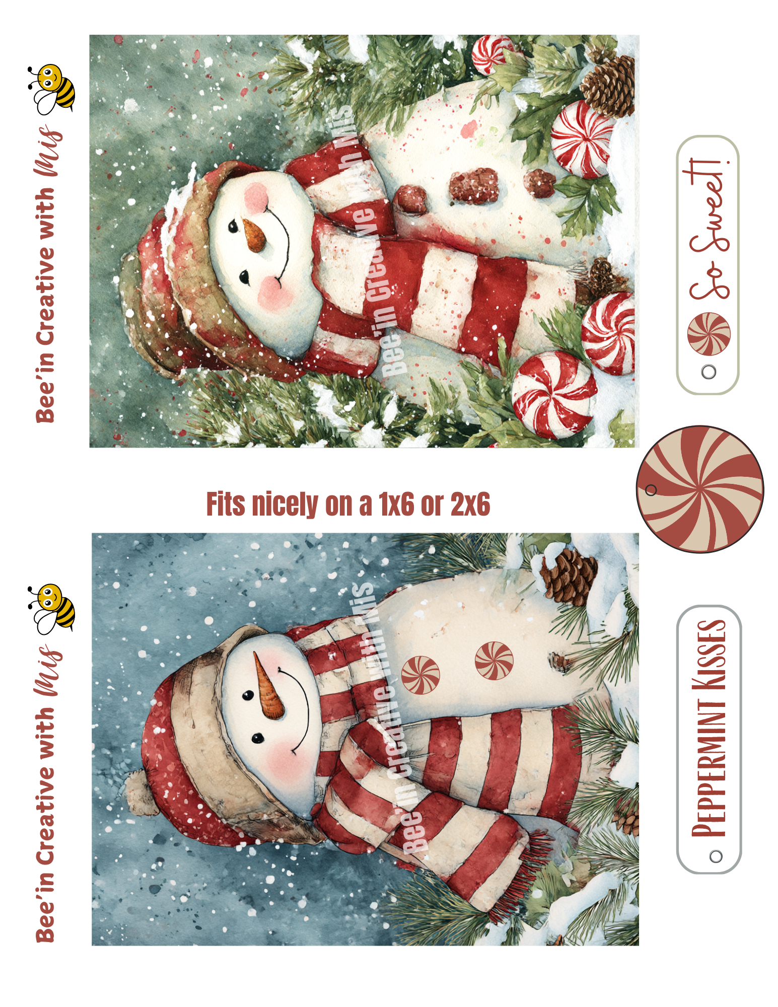 These prints fit a 1x6 or 2x6 board nicely. These sweet snowmen are perfect for adding a fun touch to your winter crafts! You can add some Rock Candy Glitter to really bring your project to life. Use these wooden buttons (turn over and paint on the backside) to create peppermint candy buttons@