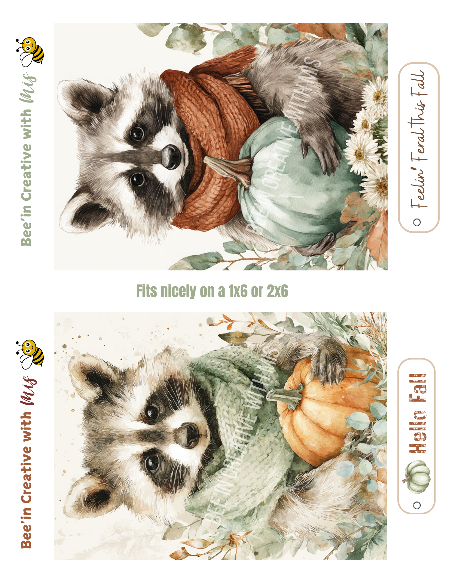These prints fit a 1x6 or 2x6 board nicely. These cute raccoons are perfect for creating fun fall projects!