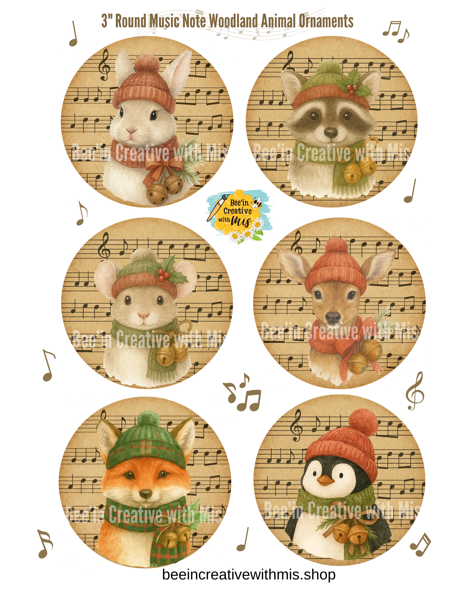 Woodland Animal Music Note 3" Circle Ornaments or Tag Printable